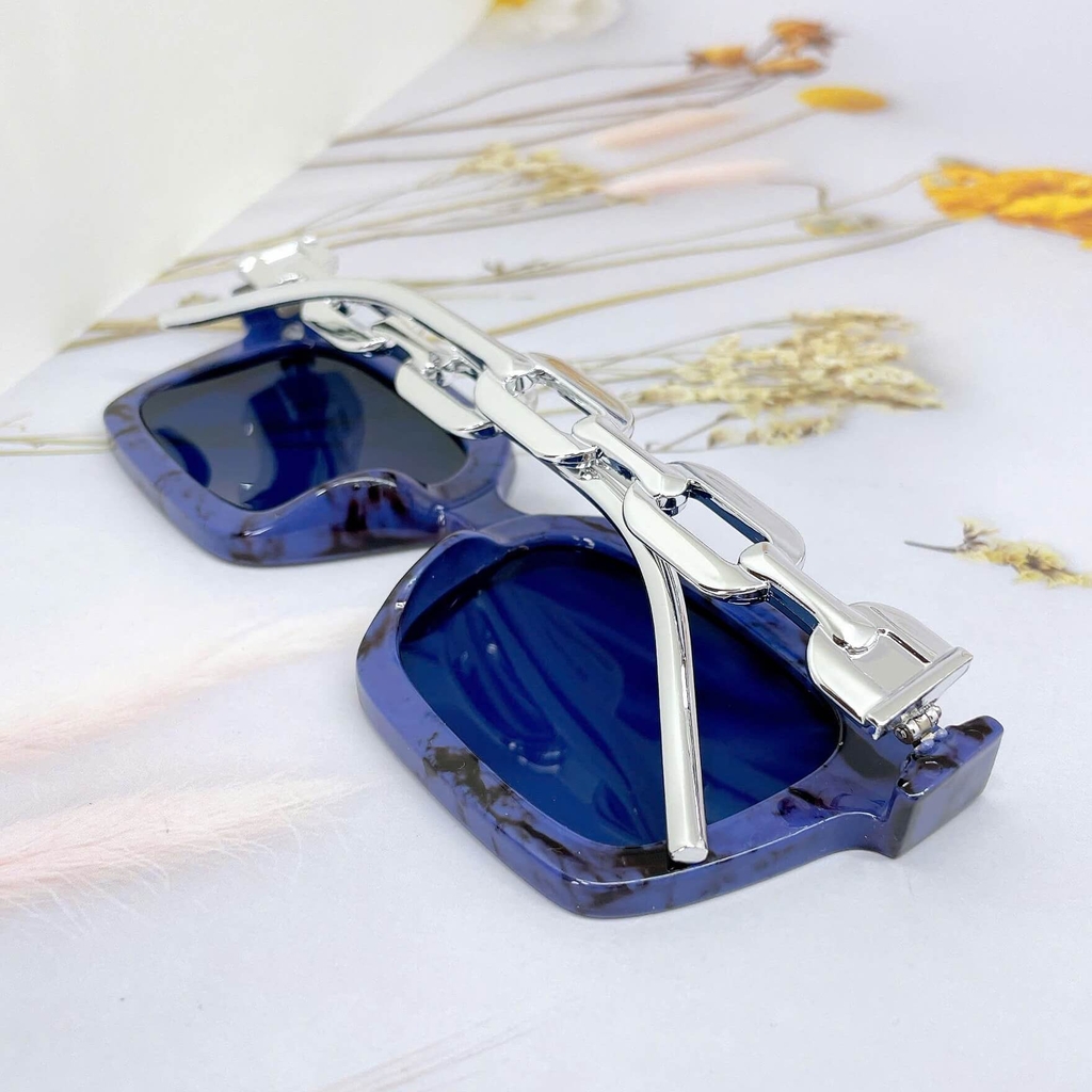 Thiết kế tròng vuông cá tính, gam xanh thời thượng kết hợp cùng gọng kim loại dáng mắc xích màu silver tạo nên tổng thể sang trọng, tinh tế và cực kỳ cuốn hút.